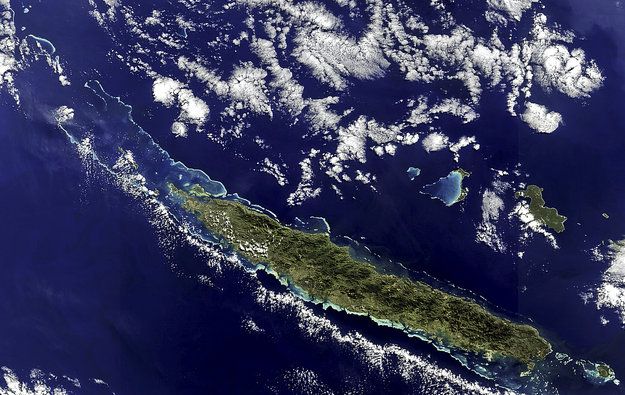 The main island, Grande Terre, dominates the image, stretching 350 km long from northwest to southeast. A mountain range runs the length of the island – its highest point reaching over 1620 m – and divides the land’s lush east from the savannahs in the west.